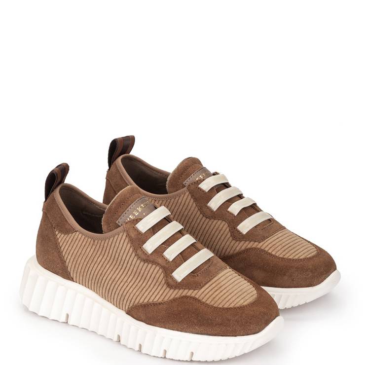 Zapatillas elaboradas en ante y pana. Plantilla extraíble. Suela de goma de 4 cm. Cierre con cordones elásticos.