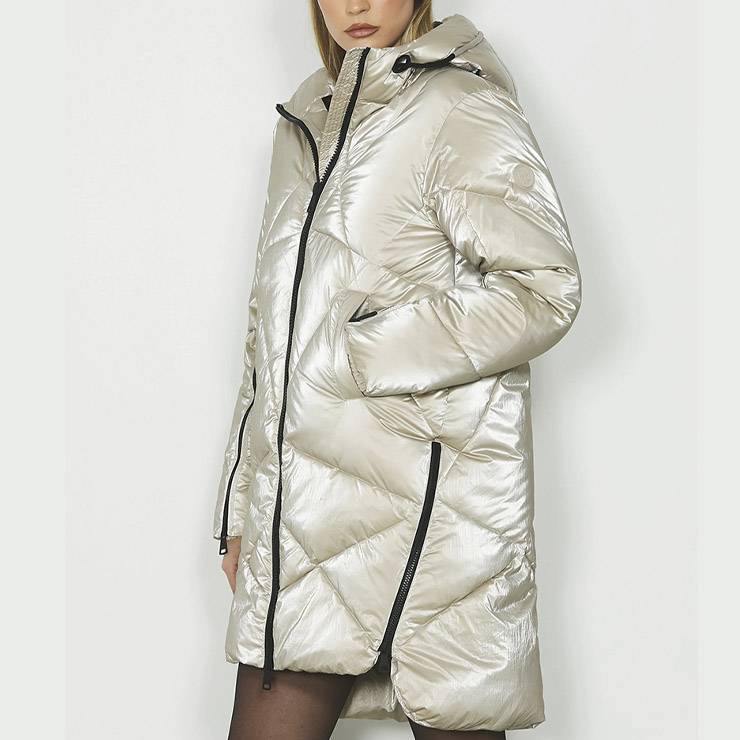 Abrigo tipo plumas elaborado en poliamida y PU. Mangas abullonadas y capucha. Cordón y cremallera en contraste.