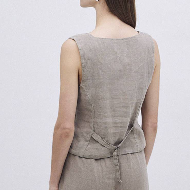 Chaleco 100% lino European Flax. Tintura OEKO TEX. Diseño recto. Escote de pico. Cierre con botones efecto carey. Tira ajustable detrás.
