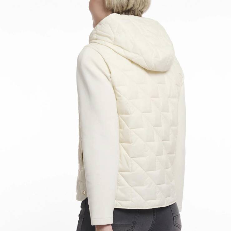 Chaqueta acolchada ligera con mangas de neopreno. Capucha desmontable y bolsillos laterales. Cierre con cremallera frontal. Aberturas laterales.