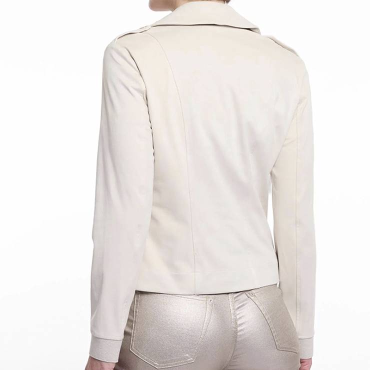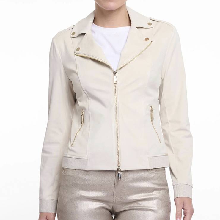 Chaqueta tipo biker elaborada en antelina. Chaqueta corta y ajustada. Cuello con solapa. Cierre de cremallera bidireccional en la parte delantera. Bolsillos laterales con cierre de cremallera y puños elásticos.