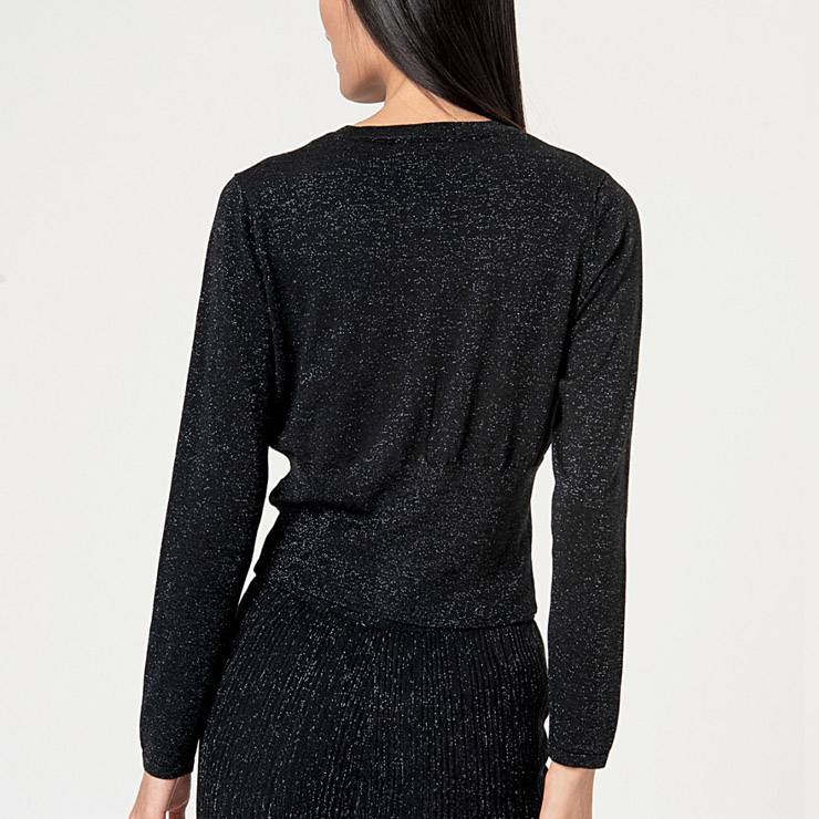 Chaqueta tipo cárdigan corta de punto. Manga larga y cuello redondo. Hilo de lurex metalizado y cierre frontal con botones.