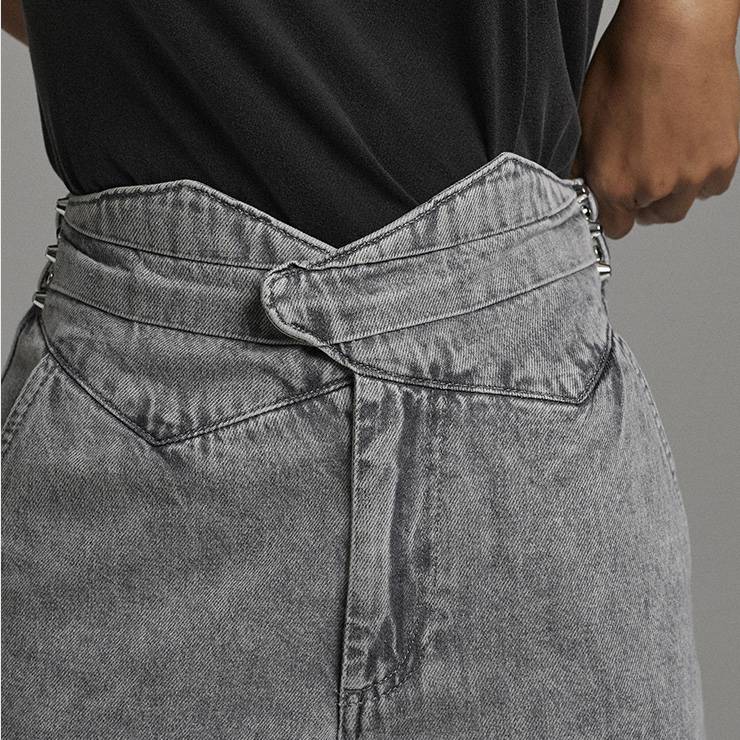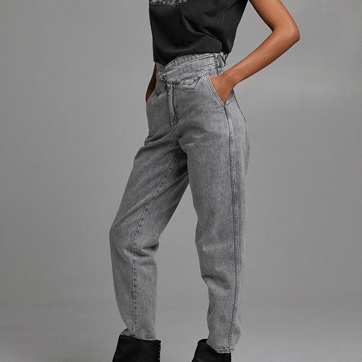 Pantalón largo estilo denim mom fit de algodón. Tiro alto. Cierre de botón y cremallera. Cintura elástica con detalle de tachuelas.