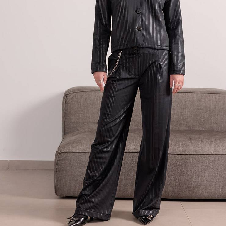 Pantalón ancho y fluido. Elaborado en poliamida. Piernas acampanadas en la parte inferior. Pequeña cadena situada en la cintura en el lado derecho del pantalón. Cierre con botón y cremallera.