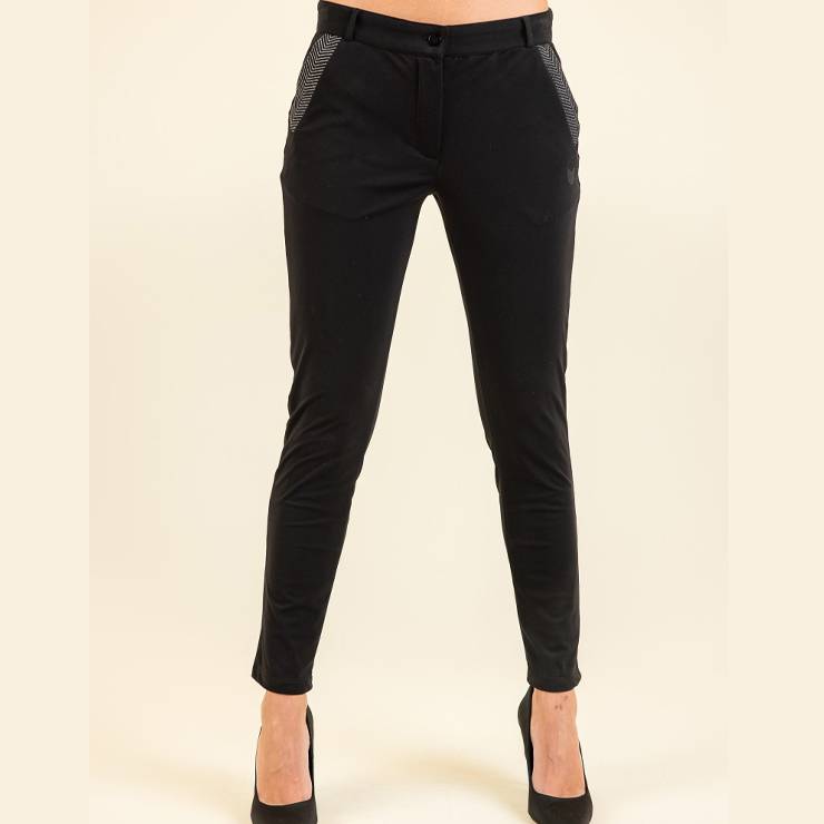 Pantalón elaboradoro en poliamida cepillada en color negro con detalles en plata. Ajuste clásico. Cierre con botón y cremallera.