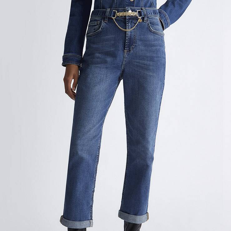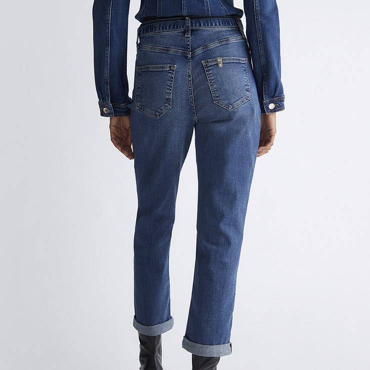 Pantalón tipo vaquero en denim de algodón elástico recto con vuelta efecto desgastado. Talle alto. Corte Bottom Up. Pernera recta. Cinturón con hebilla decorativa a juego. Logotipo metálico en la parte trasera. Cierre con cremallera oculta y botón.