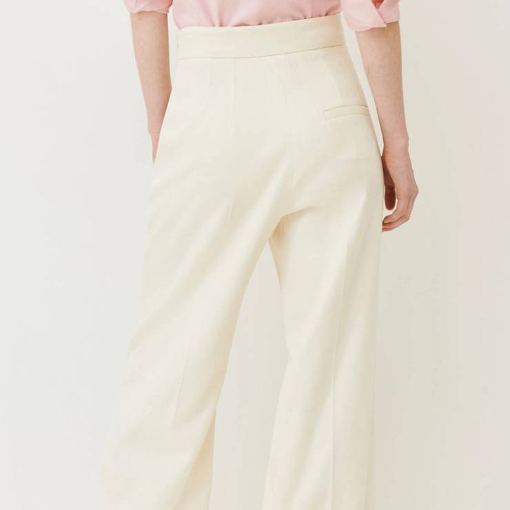 Talle alto, cierre con cremallera invisible en el lado, bolsillos delanteros al bies y bolsillo trasero ribeteado. Raya planchada por delante y por detrás.