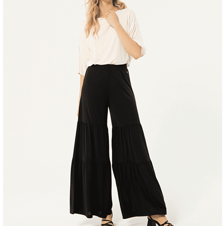Pantalón largo elaborado en modal, un tejido suave y elástico. Detalle de fruncidos efecto volatne. Sin cierres, cintura elástica.