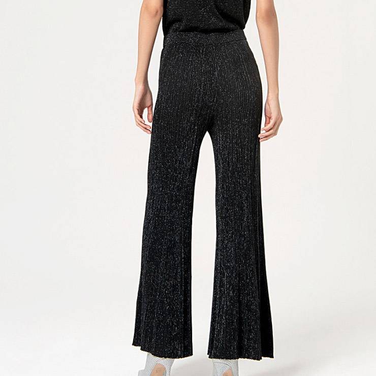 Pantalón de canalé ancho y elástico. Detalle de hilo metalizado. Goma en la cintura. Sin cierre.