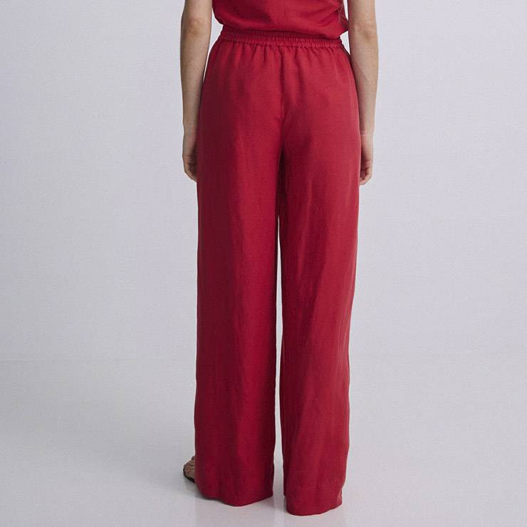 Pantalón largo elaborado en tejido mezcla de lino y tencel. Diseño wide leg. Sin cierre. Cintura elástica con tiras anudables. Dos bolsillos laterales.