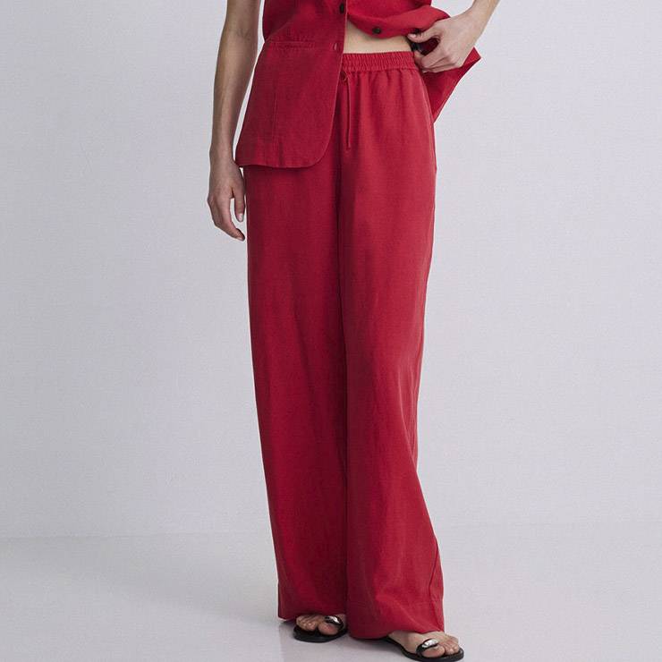 Pantalón largo elaborado en tejido mezcla de lino y tencel. Diseño wide leg. Sin cierre. Cintura elástica con tiras anudables. Dos bolsillos laterales.