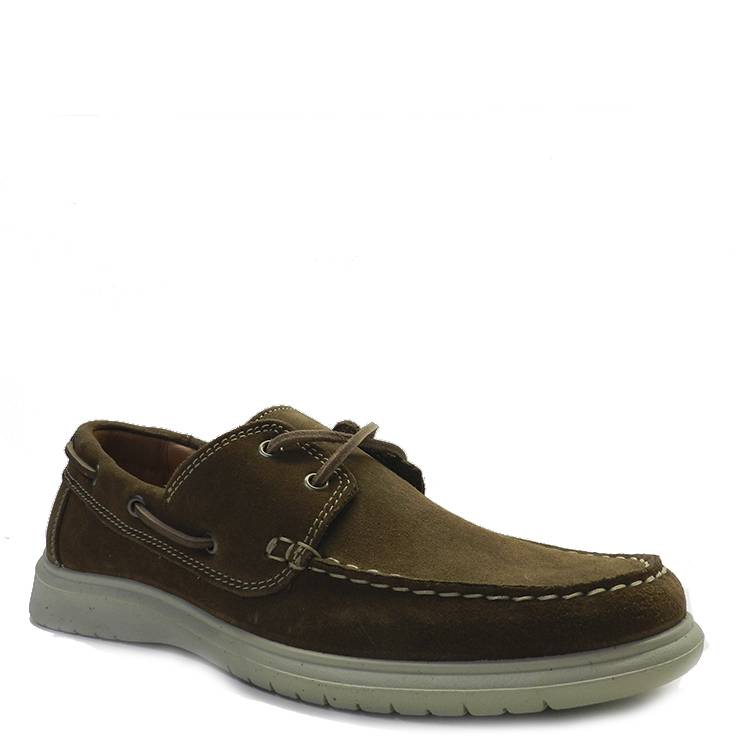 Náutico en nobuck marrón. Suela jaspeada en tono claro con un toque deportivo. Cierre con cordones de cuero.