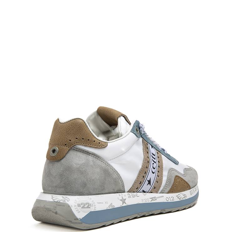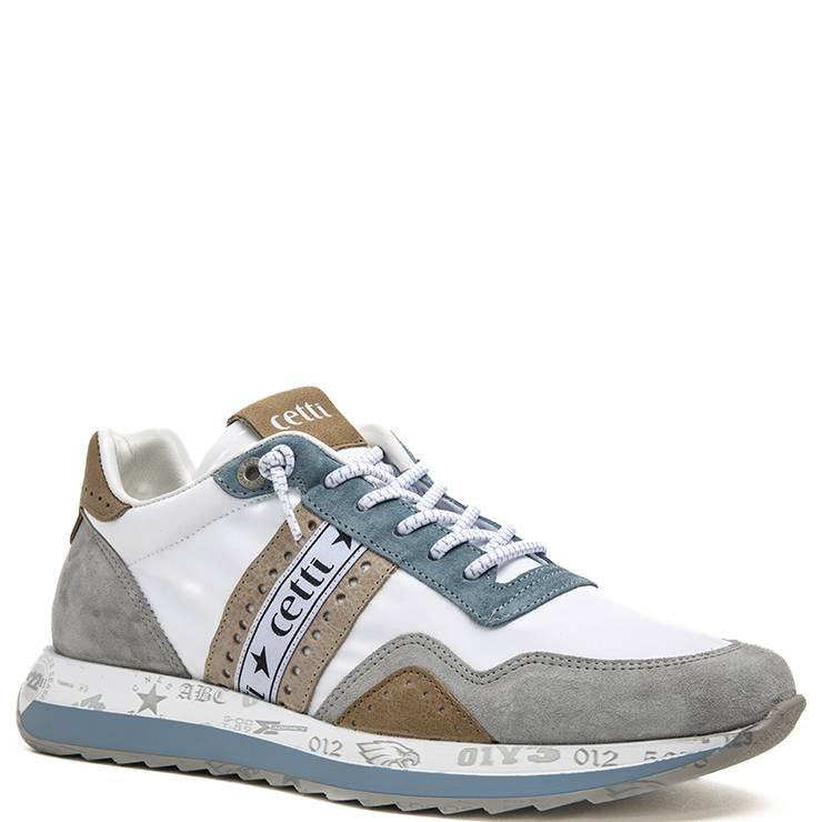 Zapatillas deportivas elaboradas en ante y nylon en combinación de blanco, beig y azul. Suela de goma de 4 cm de altura. Plantilla de piel acolchada. Cierre cordones elásticos.