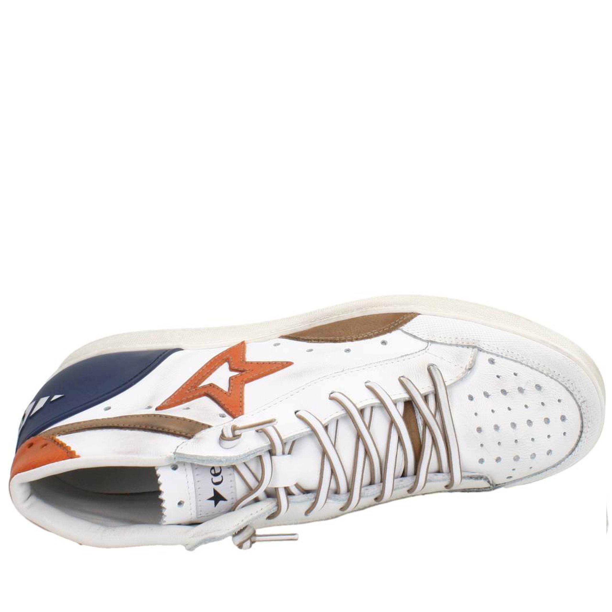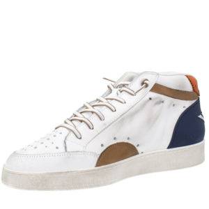 Zapatillas de la marca Cetti, modelo C1267 en color blanco. Zapatilla deportiva semi abotinada en piel napa envejecida blanca con detalles en azul y marrón. Logotipo en lateral en naranja. Suela de goma antideslizante y cierre con cordones ajustables.