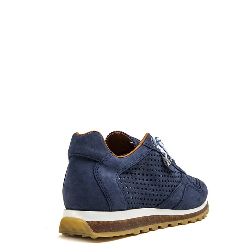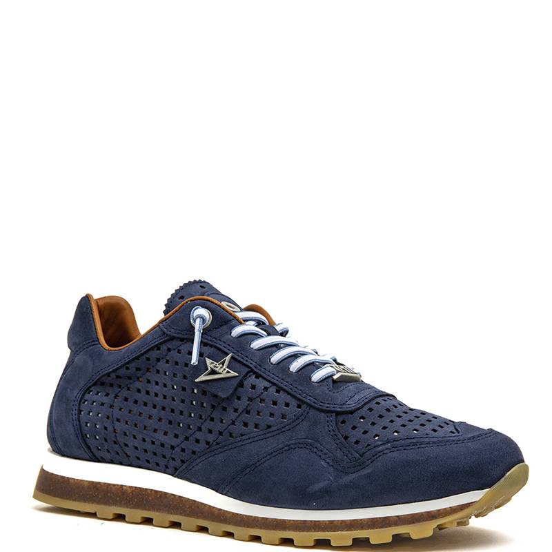Zapatillas deportivas elaboradas en piel troquelada en color azul marino. Suela plana de goma con detalle de corcho. Cierre con cordones.