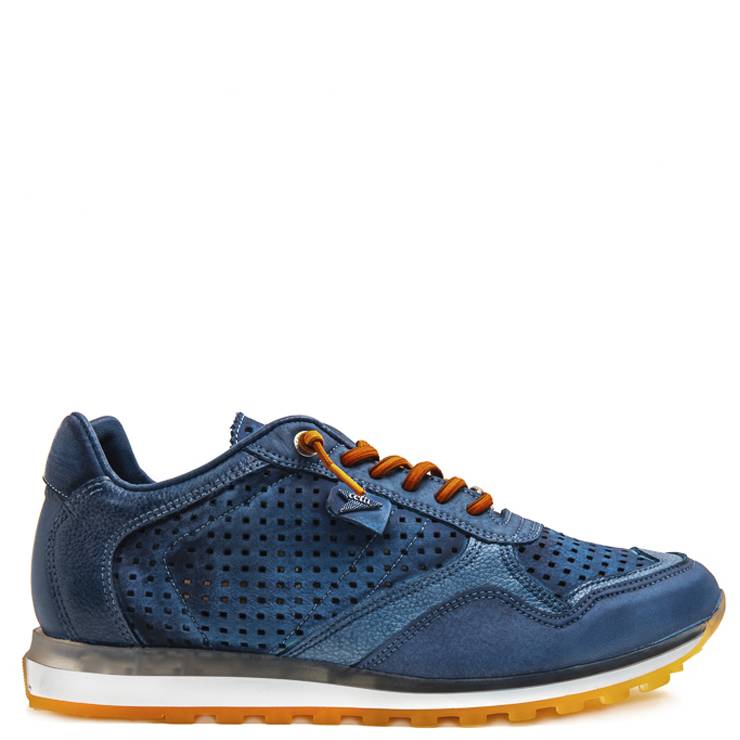 Zapatillas deportivas elaboradas en piel troquelada en color azul. Suela plana de goma con detalle de corcho. Cierre con cordones.