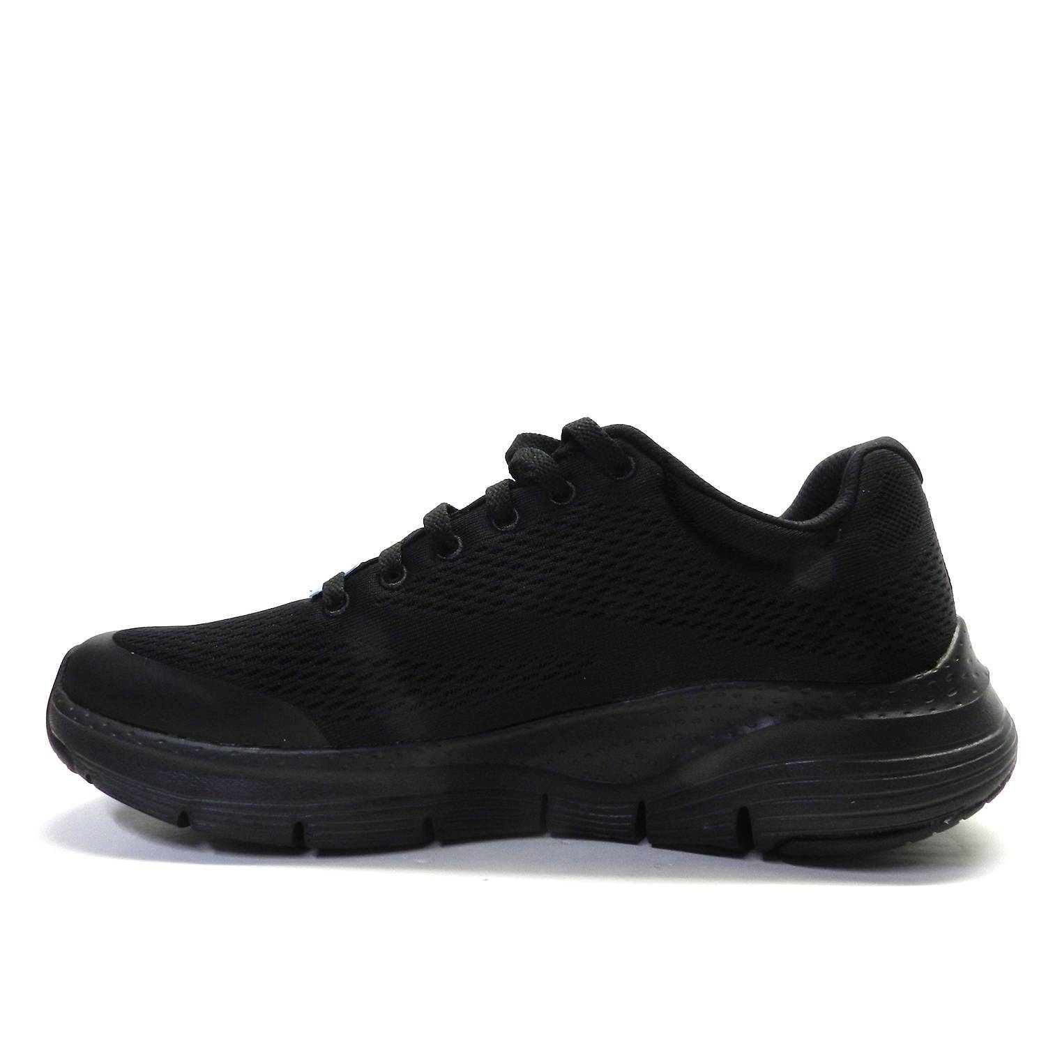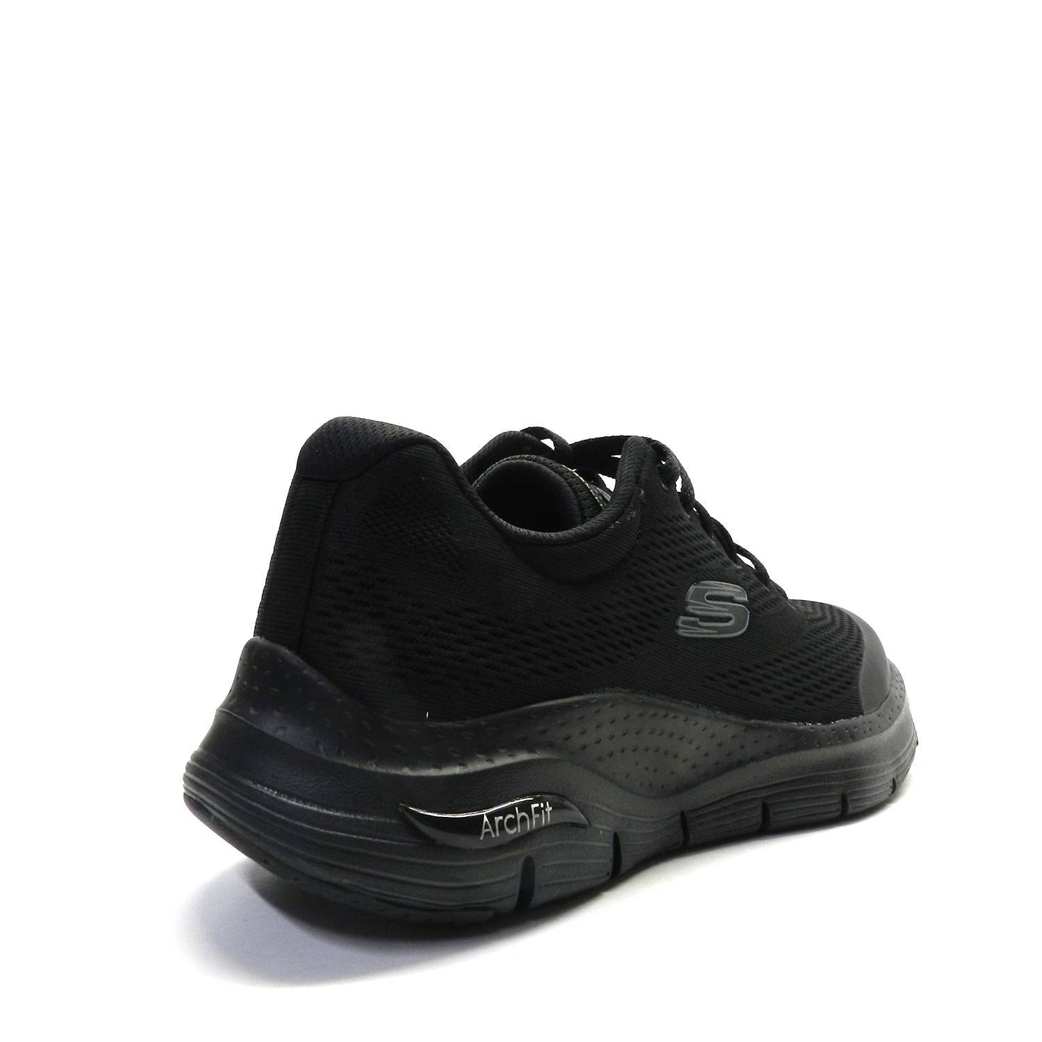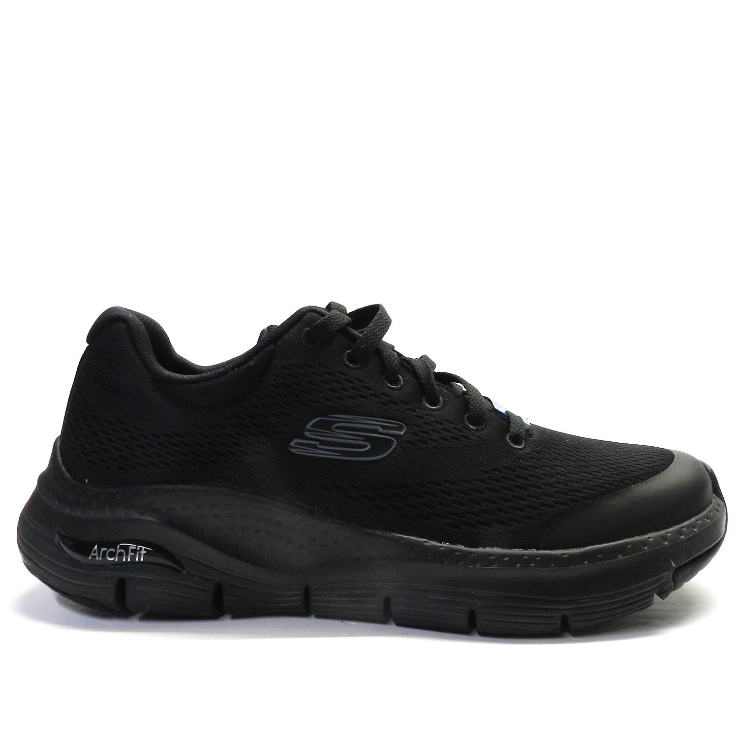 Zapatillas de la marca Skechers, modelo 232040 en color negro. Zapatillas deportivas de malla knit deportiva y tejido sintético liso. Plantilla de amortiguación extraíble Arch Fit. Media suela con amortiguación y talón de 3,8 cm. Logotipo S en el lateral. Cierre con cordones