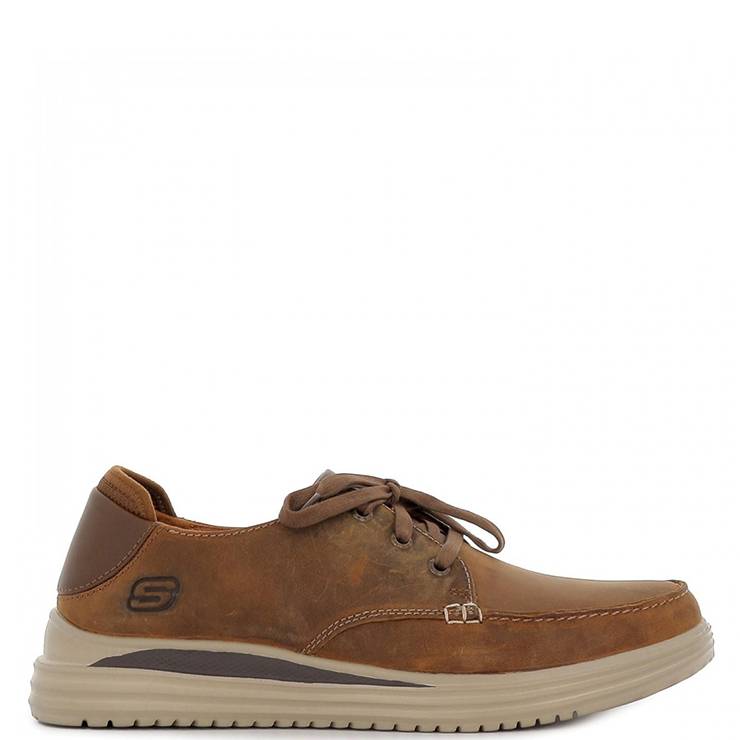 Zapato tipo blucher elaborada en cuero engrasado liso. Cierre con cordones. Plantilla acolchada Skechers Air-Cooled Memory Foam. Suela de goma de tracción flexible. Diseño de puntera de mocasín casual.