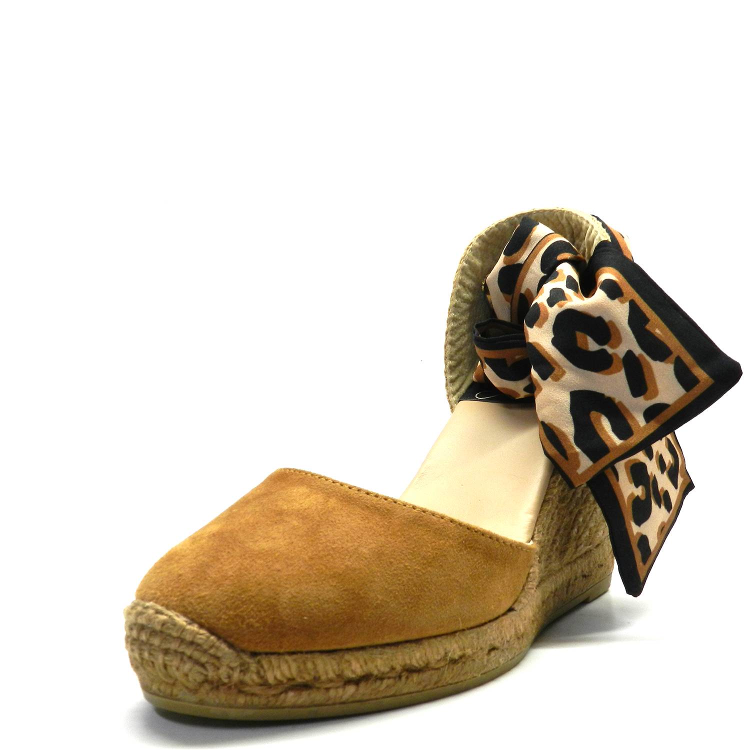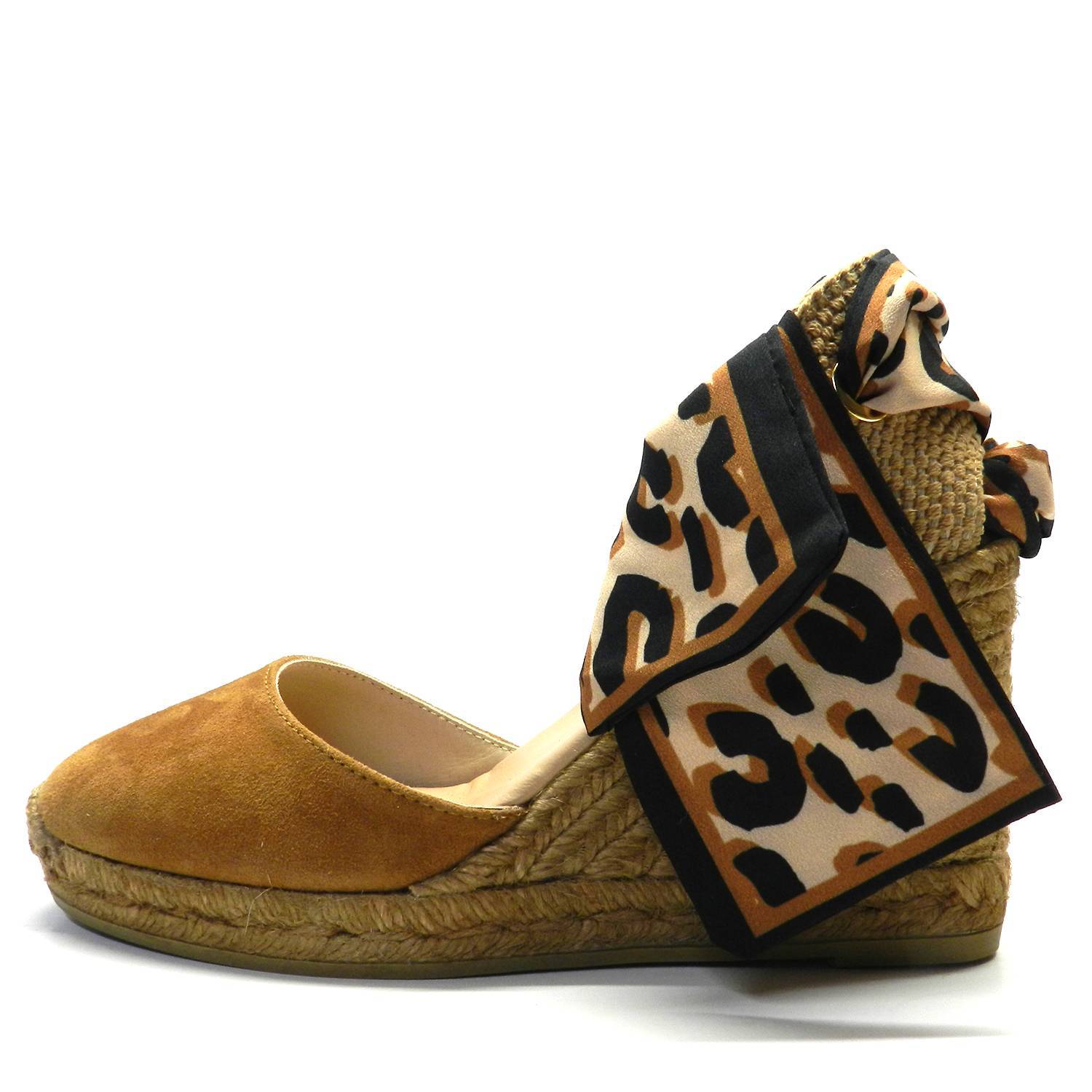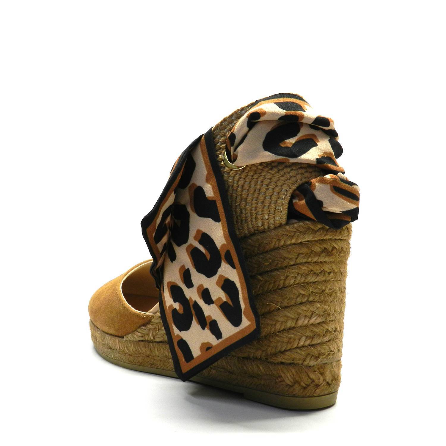 Alpargata de cuña alta en color marrón de la marca Gaimo. Corte cerrado de piel en el empeine y talonera con cierre mediante lazo con estampado leopardo en tonos marrones anudado al tobillo. Cuña de yute 100% ecológico.