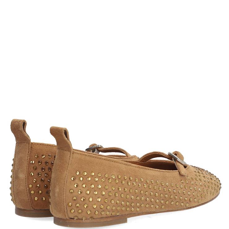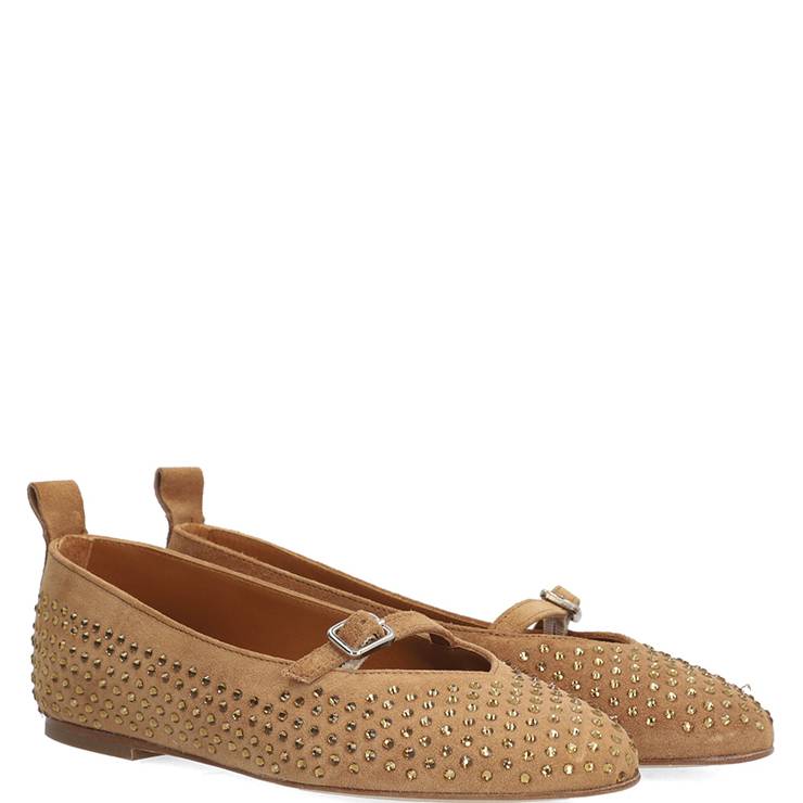 Bailarina elaborada en ante. Suela antideslizante y puntera redonda. Detalle de mini brillantes dorados. Hebilla decorativa en el empeine.