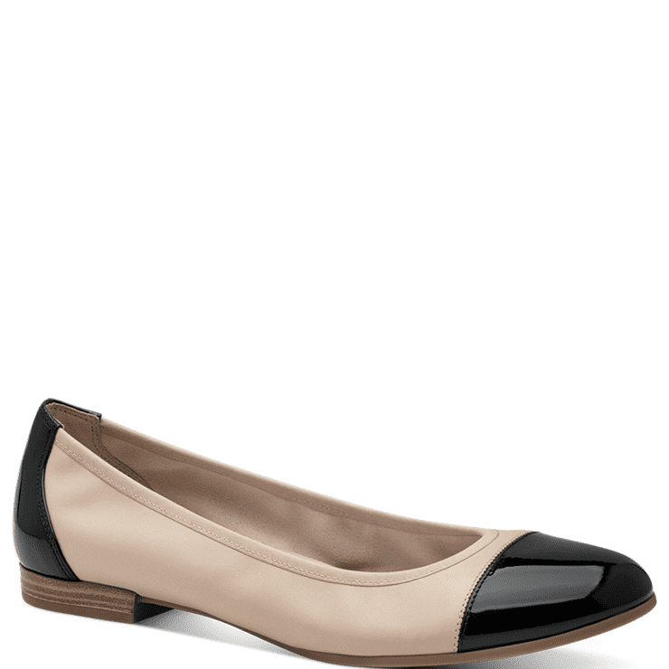 Bailarina elaborada en cuero. Cómodo tacón de bloque de 1 cm. Punta redonda y tacón ancho con tecnología Touch-it. Detalle en charol negro en punta y talón.