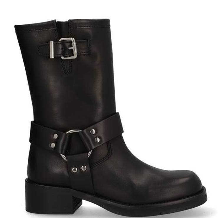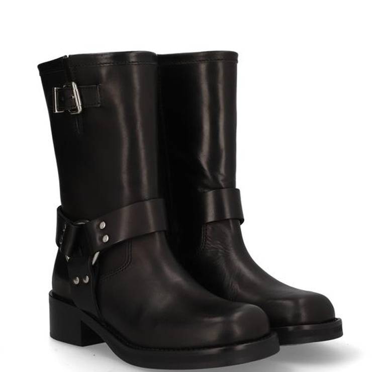 Bota tipo motero elaboradas en piel (napa). Suela de goma con tacón de 5 cm, suela antideslizante y puntera cuadrada, con cierre mediante cremallera y caña media. Detalle de anilla metálica y hebilla.
