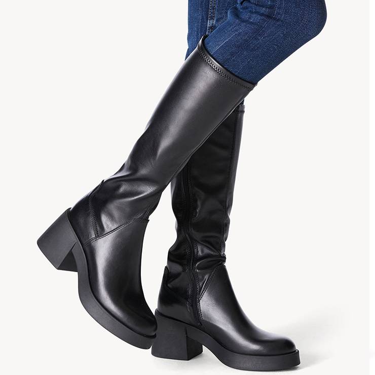 Bota alta elaborada en piel y material elástico. Suela de goma con tacón bloque de 7,5 cm de altura. Plantilla con tecnología Touch-it que se adapta perfectamente a la forma del pie. Caña elástica que garantiza un ajuste óptimo. Cierre con cremallera lateral.