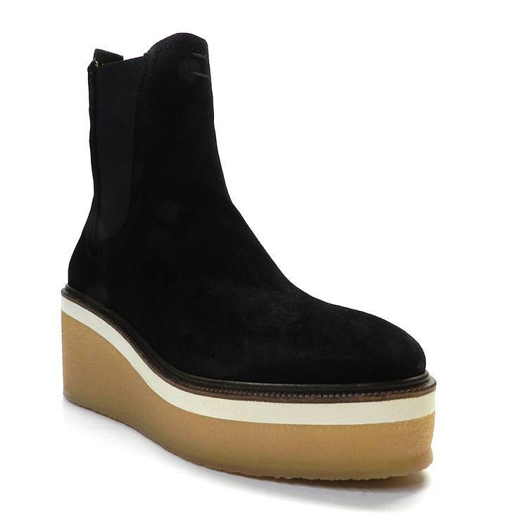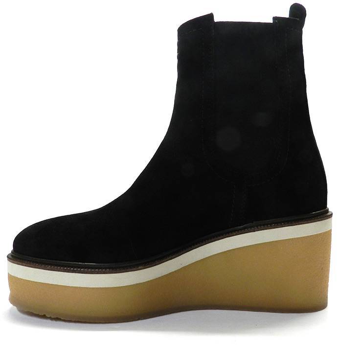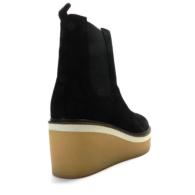Botín de la marca Alpe modelo 2218 en color negro. Botín de caña baja en piel de ante de color negro. Elásticos en los laterales. Suela de goma antideslizante con plataforma y 7 cm de cuña.