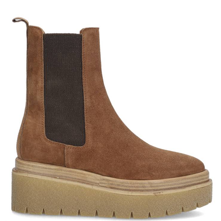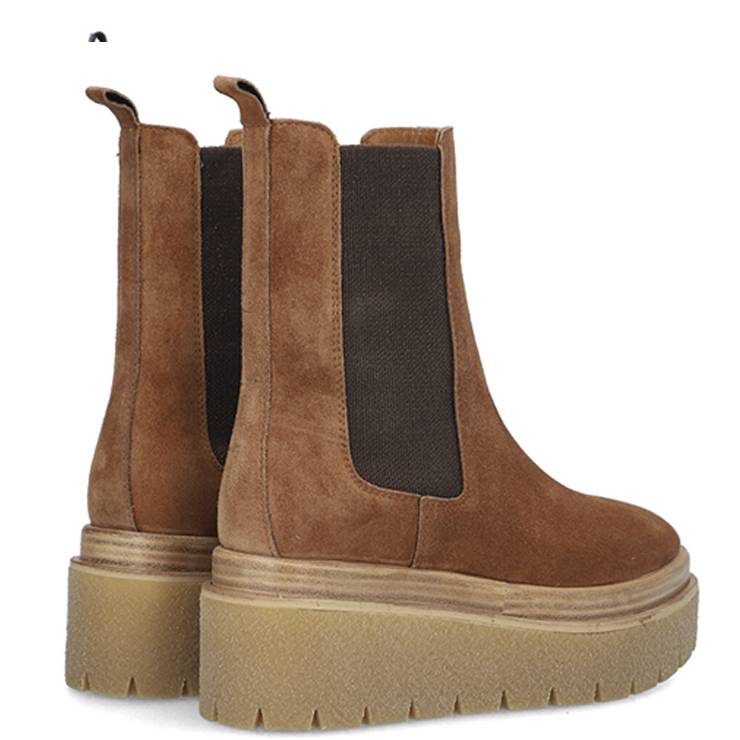 Botín de ante, con elásticos en los laterales. Pequeño tirador en el talón para facilitar el calce. Suela con cuña de estilo crepe.