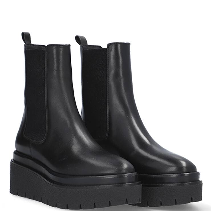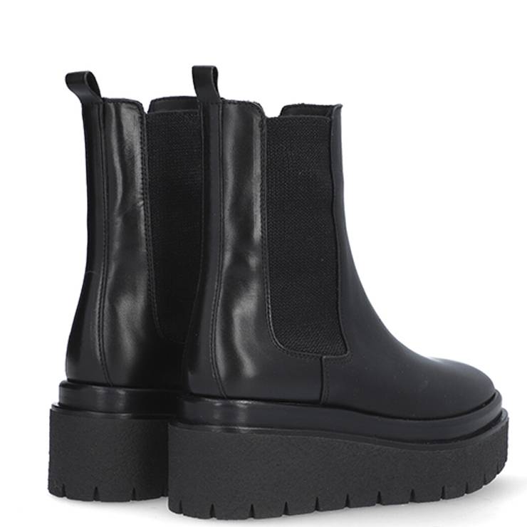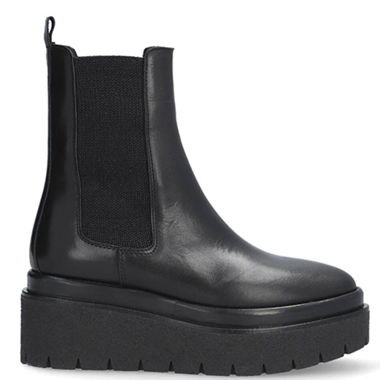 Botín de piel lisa, con elásticos en los laterales. Pequeño tirador en el talón para facilitar el calce. Suela con cuña de estilo crepe al tono.
