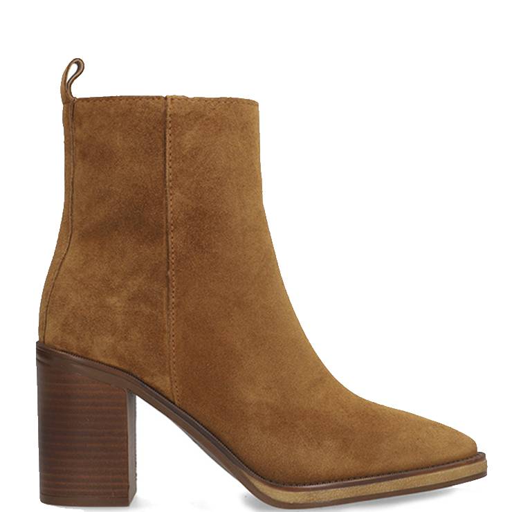 Botín elaborado en piel (baby silk). Suela antideslizante y puntera afilada. Cierre mediante cremallera y caña baja. Tacón bloque de 8 cm.