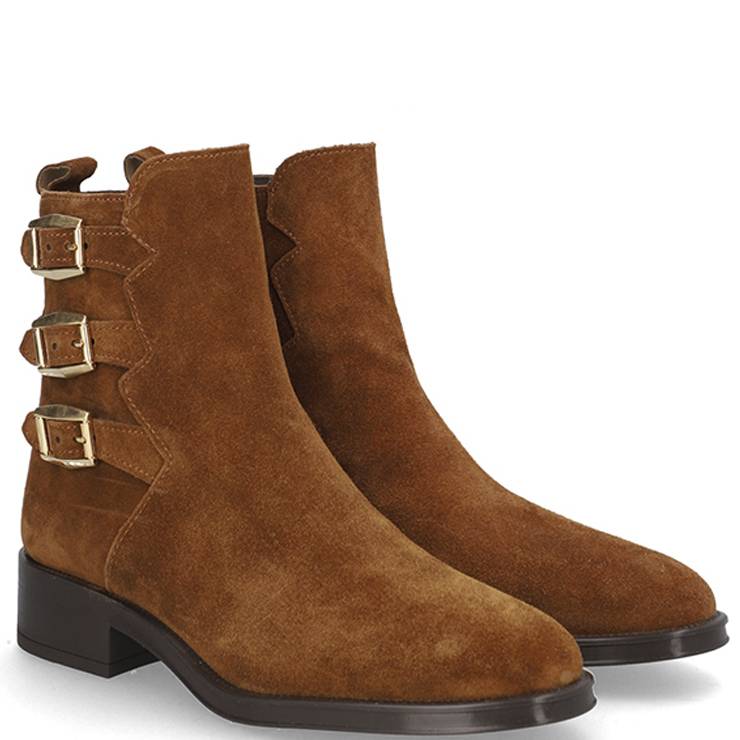 Botín elaborado en piel (baby silk). Suela antideslizante y puntera redonda. Cierre mediante triple cremallera. Tacón ancho de 3,5 cm.