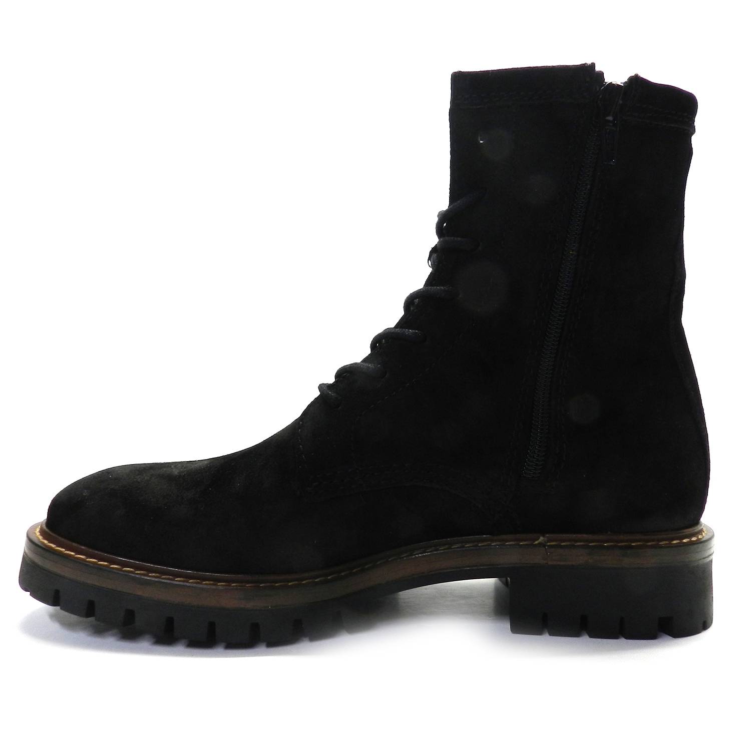 Botín de la marca Alpe modelo Militare en color negro. Botín estilo militar en serraje negro, cierre con cordones y cremallera en un lateral para abrochar con facilidad. Forro textil, planta de piel. Suela dentada de goma de 3cm de altura.