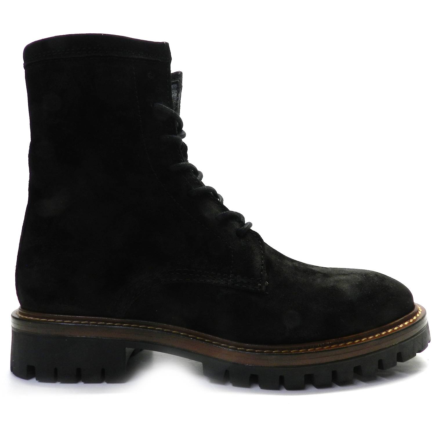 Botín de la marca Alpe modelo Militare en color negro. Botín estilo militar en serraje negro, cierre con cordones y cremallera en un lateral para abrochar con facilidad. Forro textil, planta de piel. Suela dentada de goma de 3cm de altura.