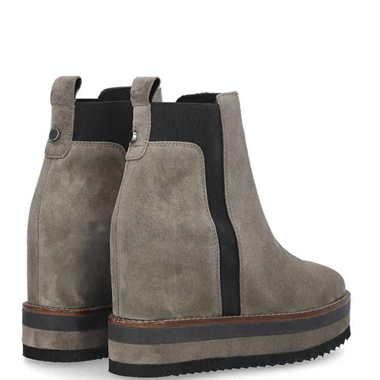 Botín elaborado en ante. Suela antideslizante y puntera redonda. Cuña oculta de 8,5 cm de altura. Sin cierre con elásticos en los laterales.