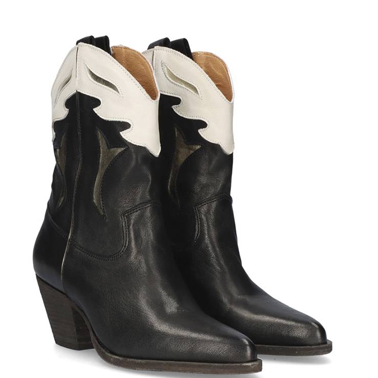 Botín estilo cowboy en piel negra con detalles en platino metalizado. Suela de goma y tacón campero de 6,5 cm de altura. Plantilla piel. Sin cierre, con tirador en la parte superior para facilitar el calce.
