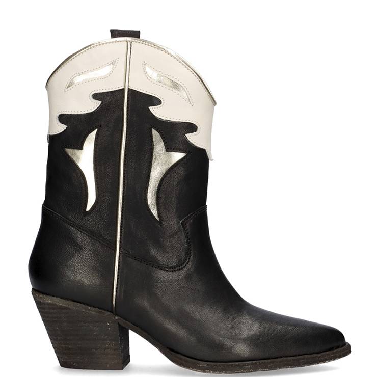 Botín estilo cowboy en piel negra con detalles en platino metalizado. Suela de goma y tacón campero de 6,5 cm de altura. Plantilla piel. Sin cierre, con tirador en la parte superior para facilitar el calce.