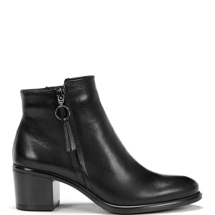 Botín de tacón elaborada en piel lisa. Tacón ancho de 5 cm de altura. Suela de TPU. Plantilla extraíble. Cierre con cremallera lateral interna.