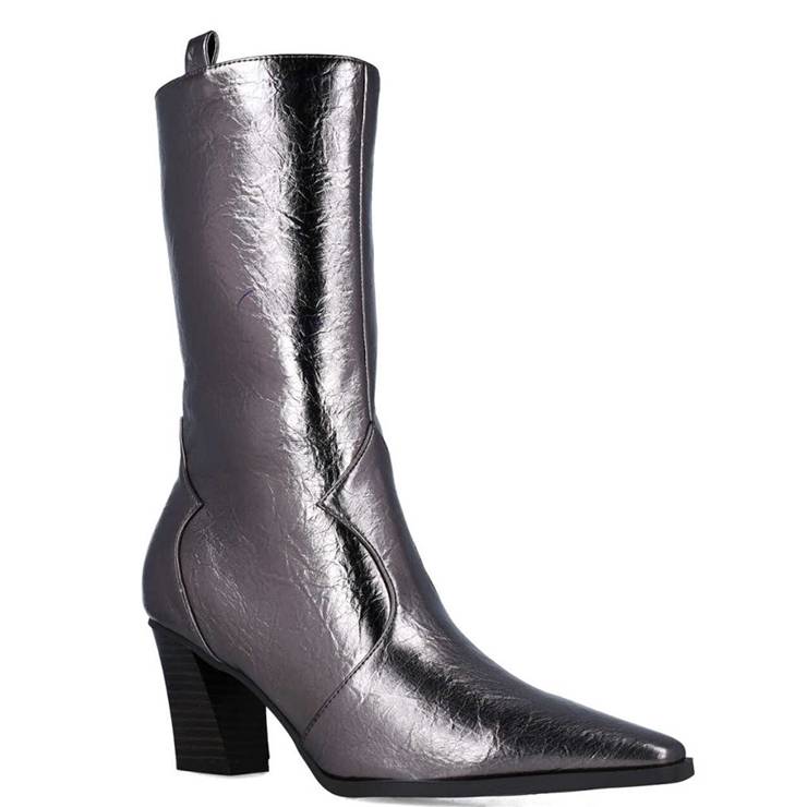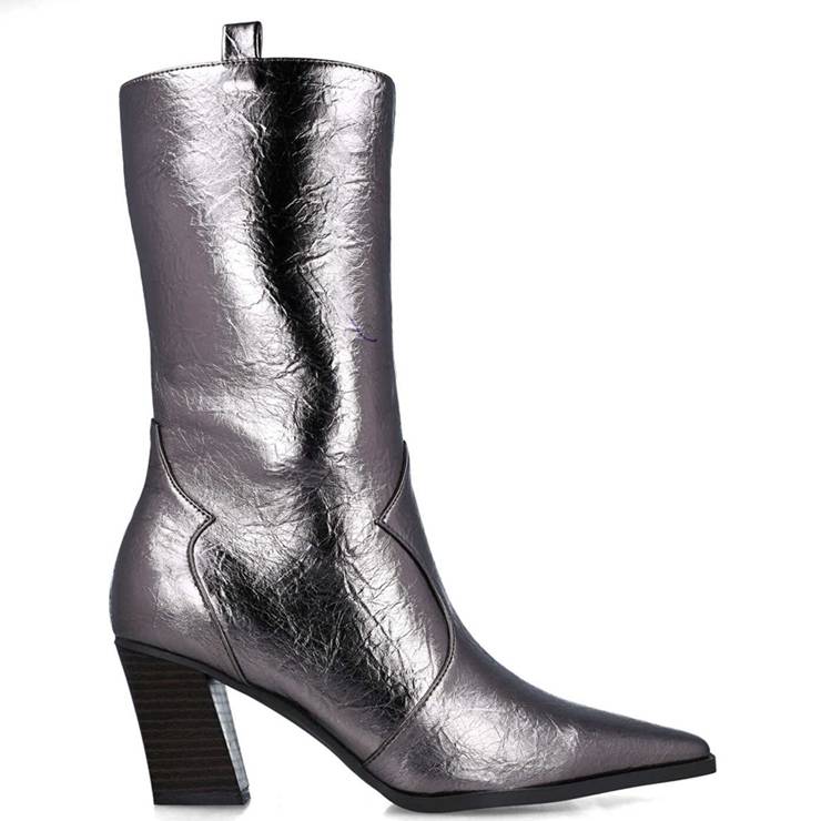 Botín de tacón elaborado en napa arrugada, punta afilada. Tacón de 6,5 cm de altura. Tirador para facilitar el calce.