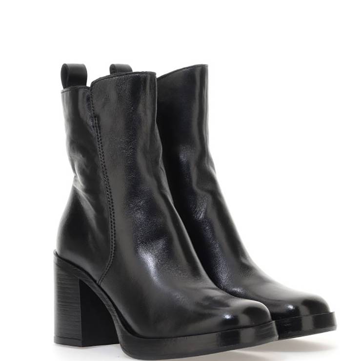 Botines elaborados en cuero. Punta cuadrada y cierre con cremallera lateral. Tacón cuadrado de 8 cm de altura y plataforma de 1,5 cm.