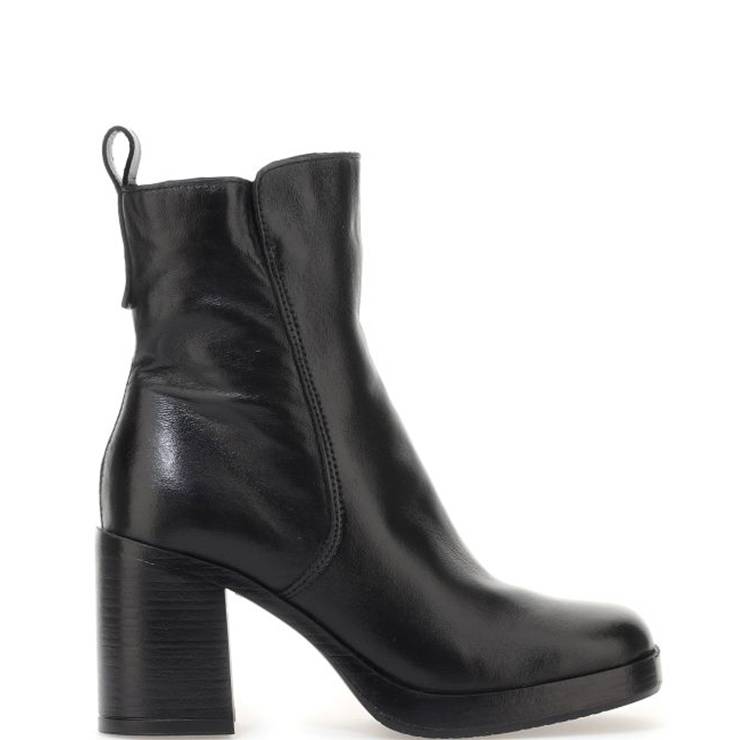 Botines elaborados en cuero. Punta cuadrada y cierre con cremallera lateral. Tacón cuadrado de 8 cm de altura y plataforma de 1,5 cm.