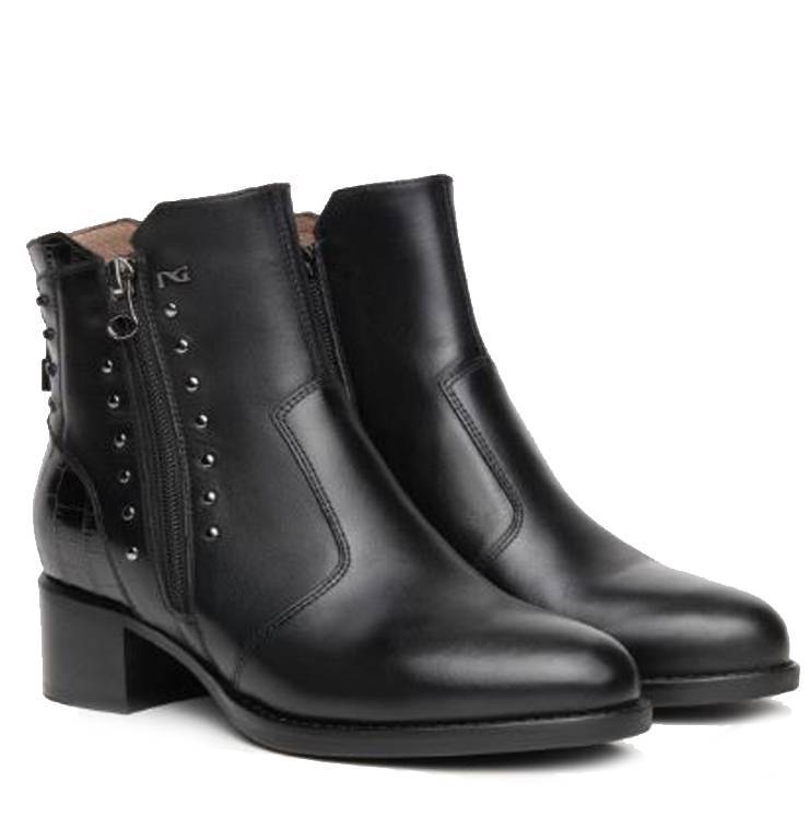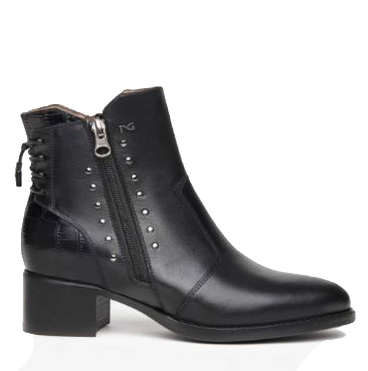 Botín de la marca Nero Giardini modelo I116761D en color negro. Botín de piel lisa y detalle coco en el talón. Cordón en la parte trasera y cremallera en ambos laterales con detalle de tachuelas. Plantilla DryGo! que absorbe humedad y garantiza confort. Tacón block de 4 cm.