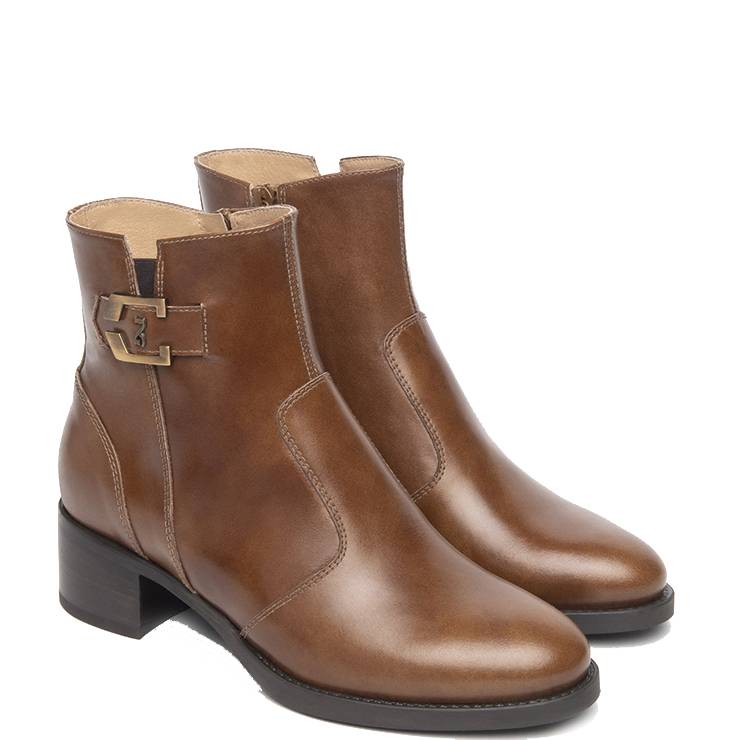Botín de tacón en napa. Tacón block de 4 cm de altura. Detalle de hebilla en el tobillo. Suela de goma. Cierre con cremallera lateral interna.