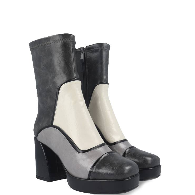 Botín de tacón elaborado en combinación de piezas de piel vegana. Forro textil y plantilla de piel. Cierre con cremallera. Suela de goma con plataforma de 2,5 cm y tacón de 8,5 cm.