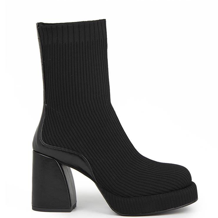 Botín de tacón elaborado en tejido elástico. Suela de goma forrada en tejido con plataforma de 3 cm y tacón cuadrado forrado en piel de 8 cm de altura. Detalle de piel en el talón. Plantilla de piel.