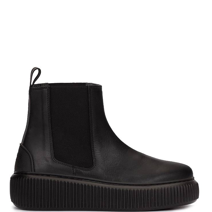 Botín deportivo de piel. Suela de caucho en contraste con plataforma de 5 cm de altura. Elásticos en los laterales y tirador para facilitar el calce.