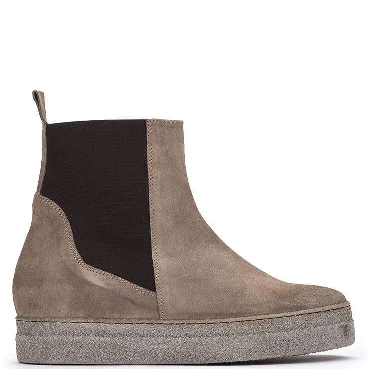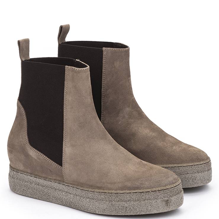 Botín con plataforma elaborado en piel de serraje. Amplios elásticos en los laterales. Suela de goma de 4 cm de altura y cuña interna de 7 cm de altura.