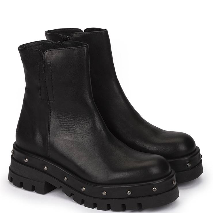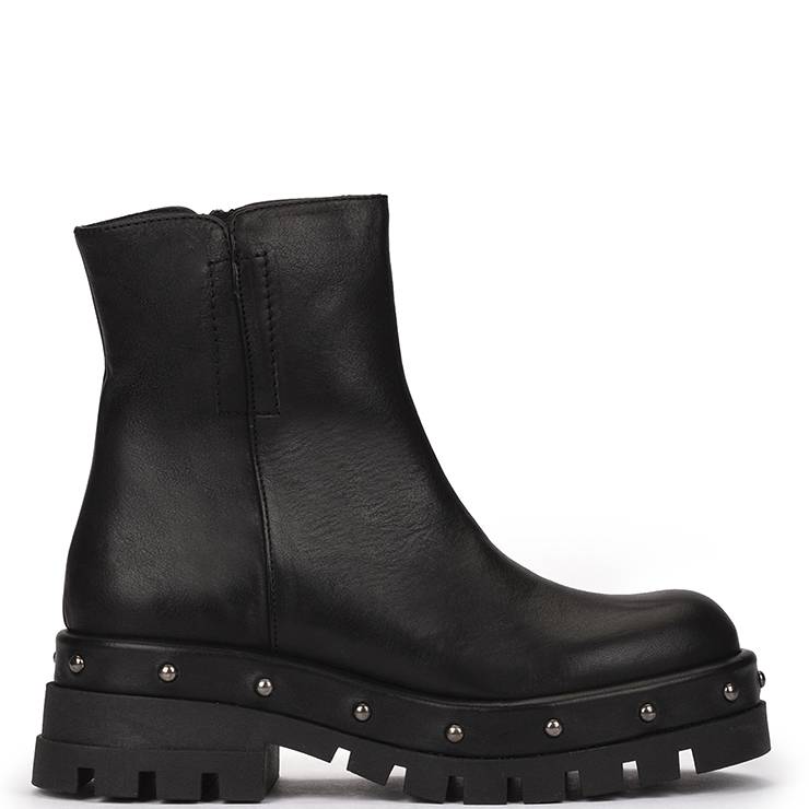 Botín de piel con suela track decorada con tachuelas. Suela track de goma con plataforma de 2 cm y tacón ancho de 4 cm.