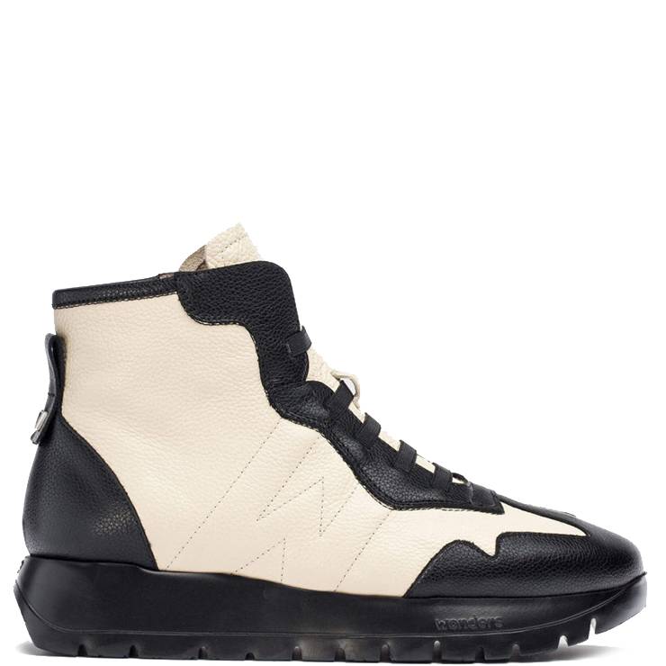 Botín deportivo elaborado en piel texturizada en combinación de beig y negro. Suela de goma EVA con 2,5 cm de altura con tecnología WondersFly™. Plantilla MemoryGel extraíble.