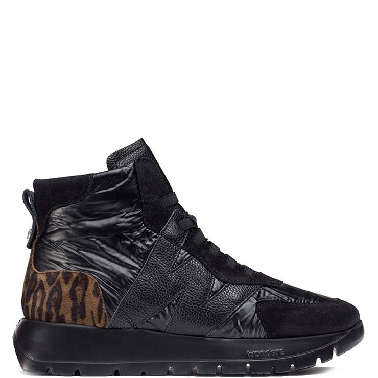 Botín deportivo elaborado en combinación de ante y textil. Detalles en animal print. Cordones elásticos. Tirador trasero. Suela de goma EVA expandida de 2.5 cm de altura. Tecnología WondersFly™. Plantilla interior extraíble de MemoryGel.